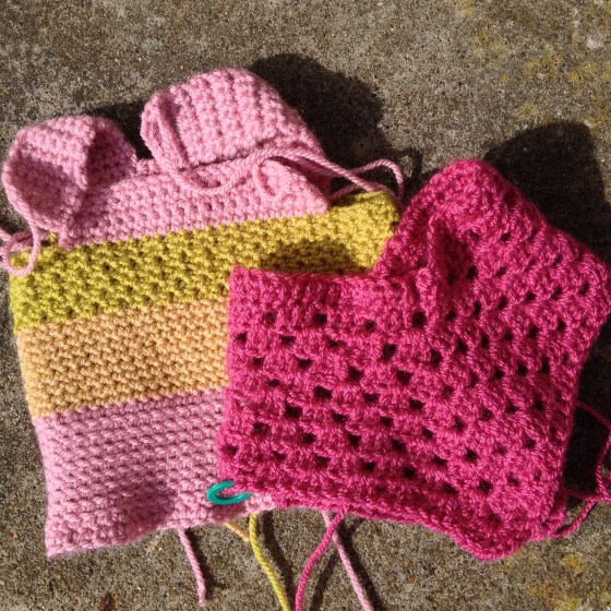 Doll’s clothes are fun, I’m finding. I’m not one for toy making, but clothes are satisfyingly fast and so cute. I did think Baby Annabell (36cm) clothes patterns would be leaping out at me, but it took quite a lot of searching on Pinterest and Ravelry. I didn’t want to design any myself and preferred to find freebies this time. I’ll take another photo when they’re both finished. Links to the patterns are here on my Ravelry project page.