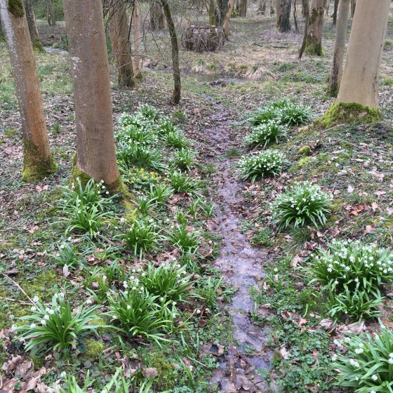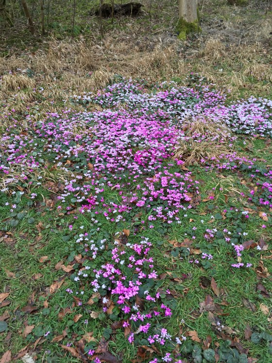 While there we heard a woodpecker, saw various birds and heard their birdsong, caught a group of about five beautiful pheasants picking their way through the undergrowth and came across no other walkers at all, no dogs, no children and no traffic noise. A perfect patch of England, and it was all ours for an hour and a half. I love this tall variety of snowdrops. Look! It’s a carpet of cyclamen.