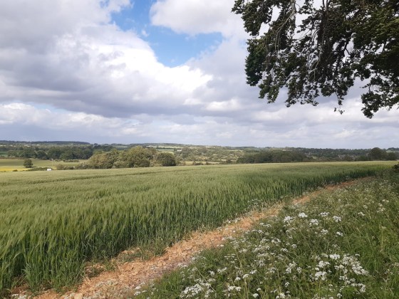 It was an exhilarating walk on a very windy day, with absolutely stunning views west and rippling fields of wheat.