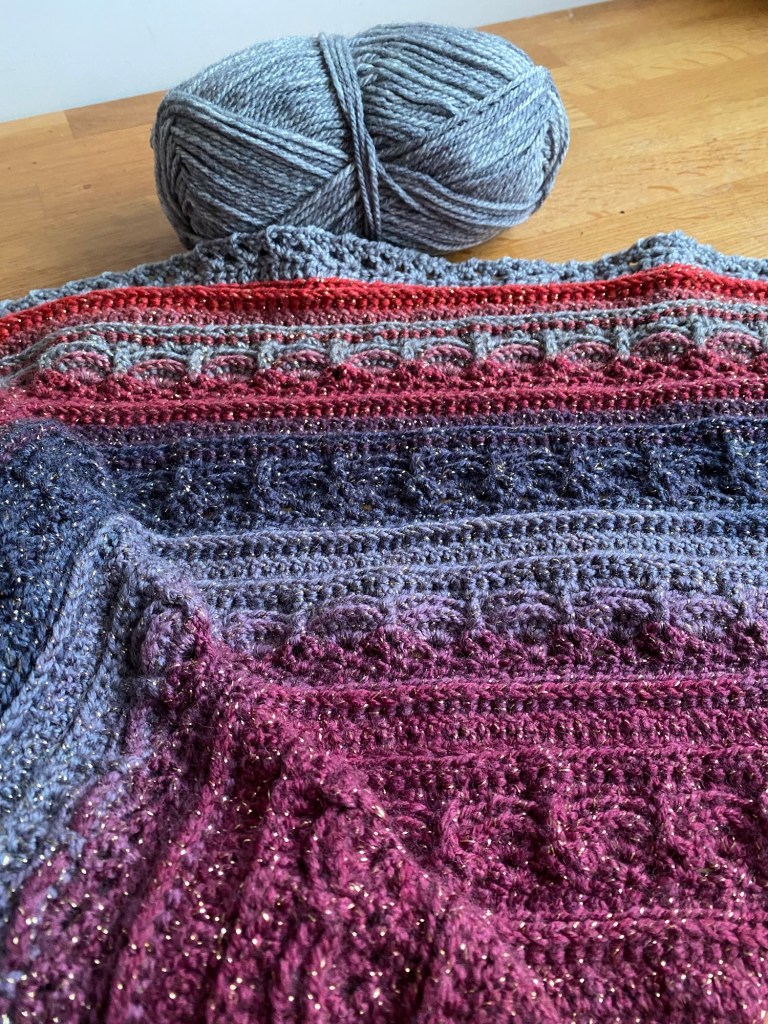 The last two rows of the slightly marled grey yarn is a new ball I bought on Monday. I’m not entirely happy with it, although I tried hard to match the yarns. It’s also aran and has roughly 20% of wool like the Katia silver paint, now discontinued, that I used for the rest of the shawl, but it feels thicker. I think it’s going to be much bulkier when I start to crochet the shells. My plan is to search eBay, yet again, and then email Katia brand and throw myself on their mercy in hope of a stray ball, or a recommendation of another of their yarns which may be a better match. It can’t hurt, can it?
