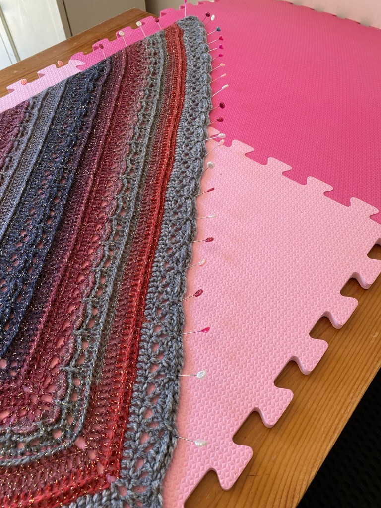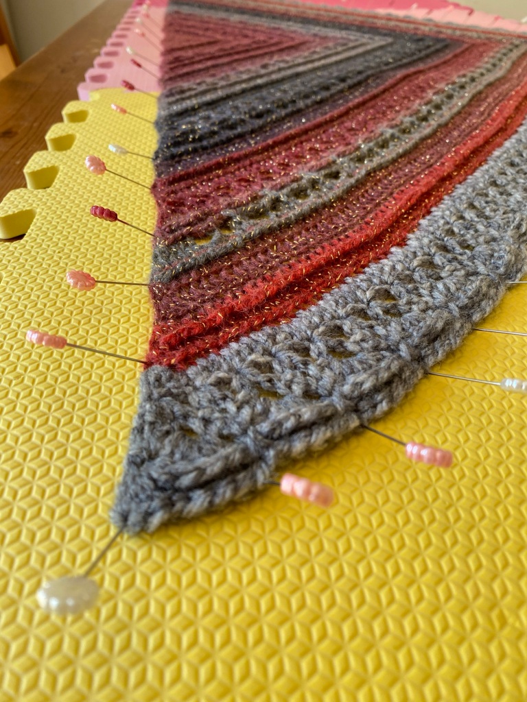 I’ve been waiting for good weather to block my Ana Lucia shawl, and it’s finally, finally here! Today’s top temperature is going to be the highest so far this year.