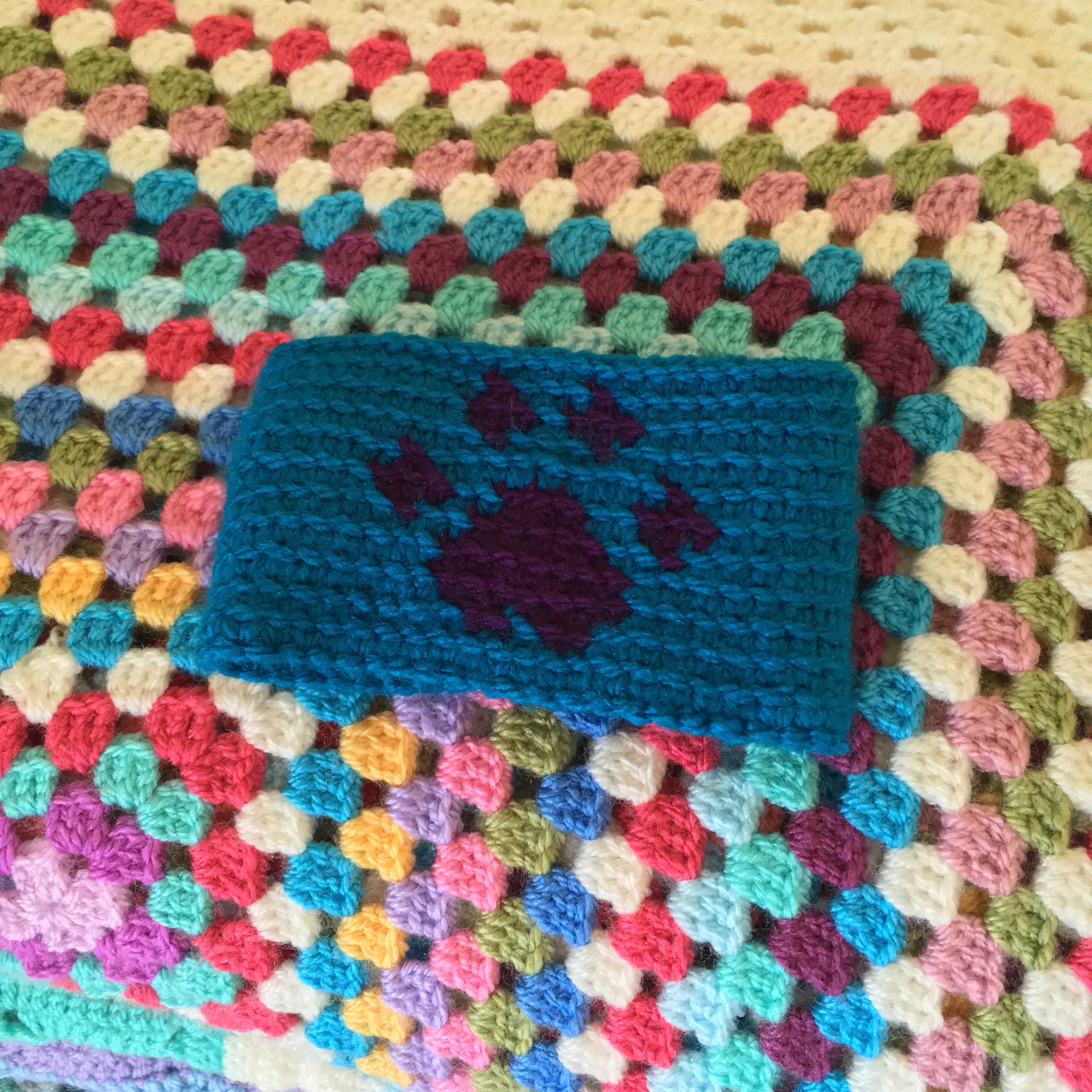 Last night I chose my border colours and sat down to start the tricky first row. I don’t think I want to crochet through the end posts again, yes it’s less gappy than working around, but it means you’re in danger of pushing out some of your darned ends. Phooey! It’s also damned tricky to do. That made me pack up my Hitchhiker knitting to take to Knit Group instead; as I didn’t think the light would be good enough to see, or the company would want to hear my groans and sighs.