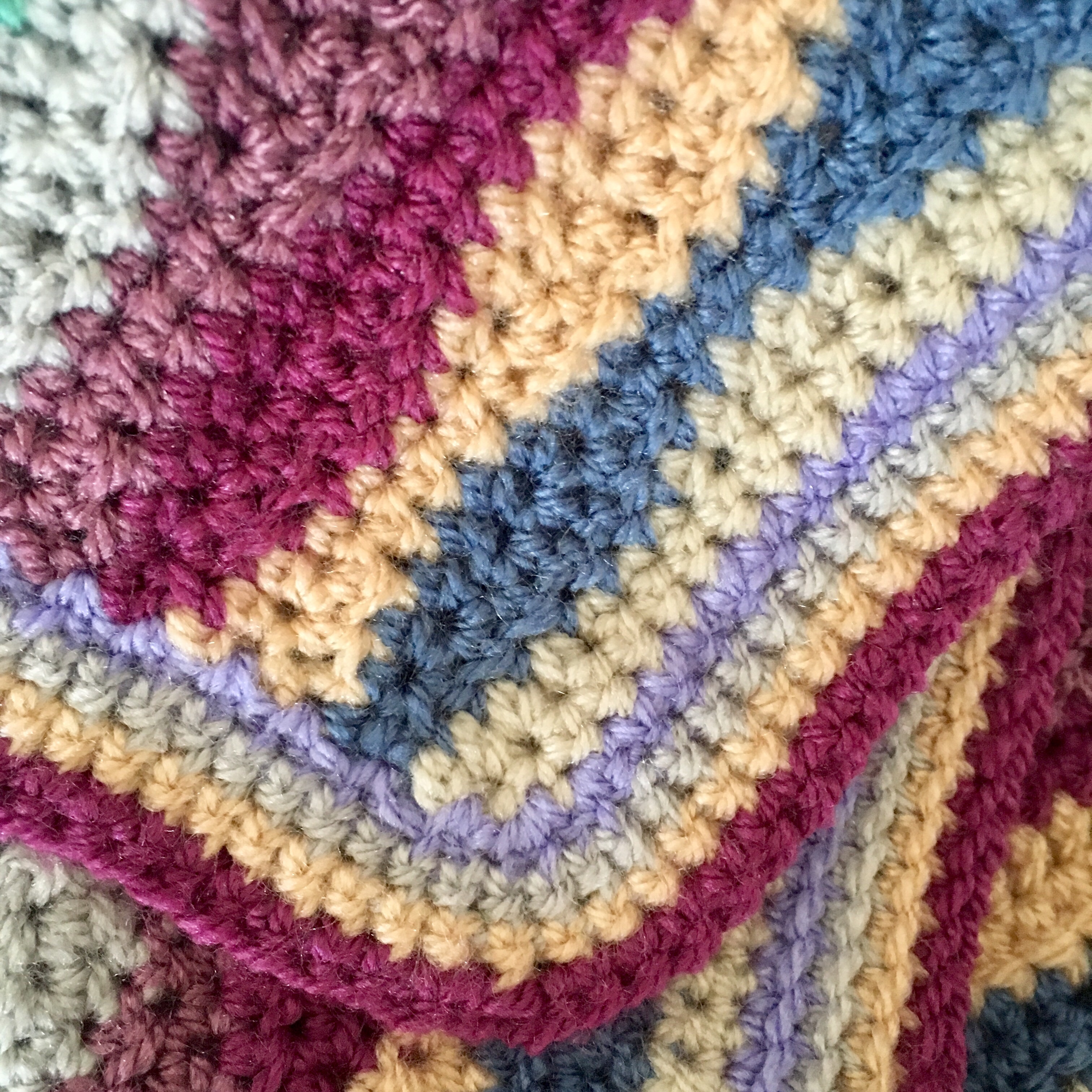 Last night I chose my border colours and sat down to start the tricky first row. I don’t think I want to crochet through the end posts again, yes it’s less gappy than working around, but it means you’re in danger of pushing out some of your darned ends. Phooey! It’s also damned tricky to do. That made me pack up my Hitchhiker knitting to take to Knit Group instead; as I didn’t think the light would be good enough to see, or the company would want to hear my groans and sighs.