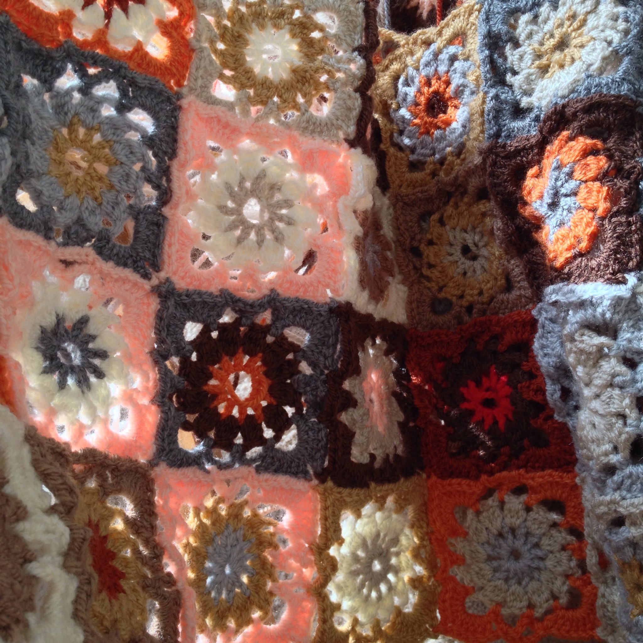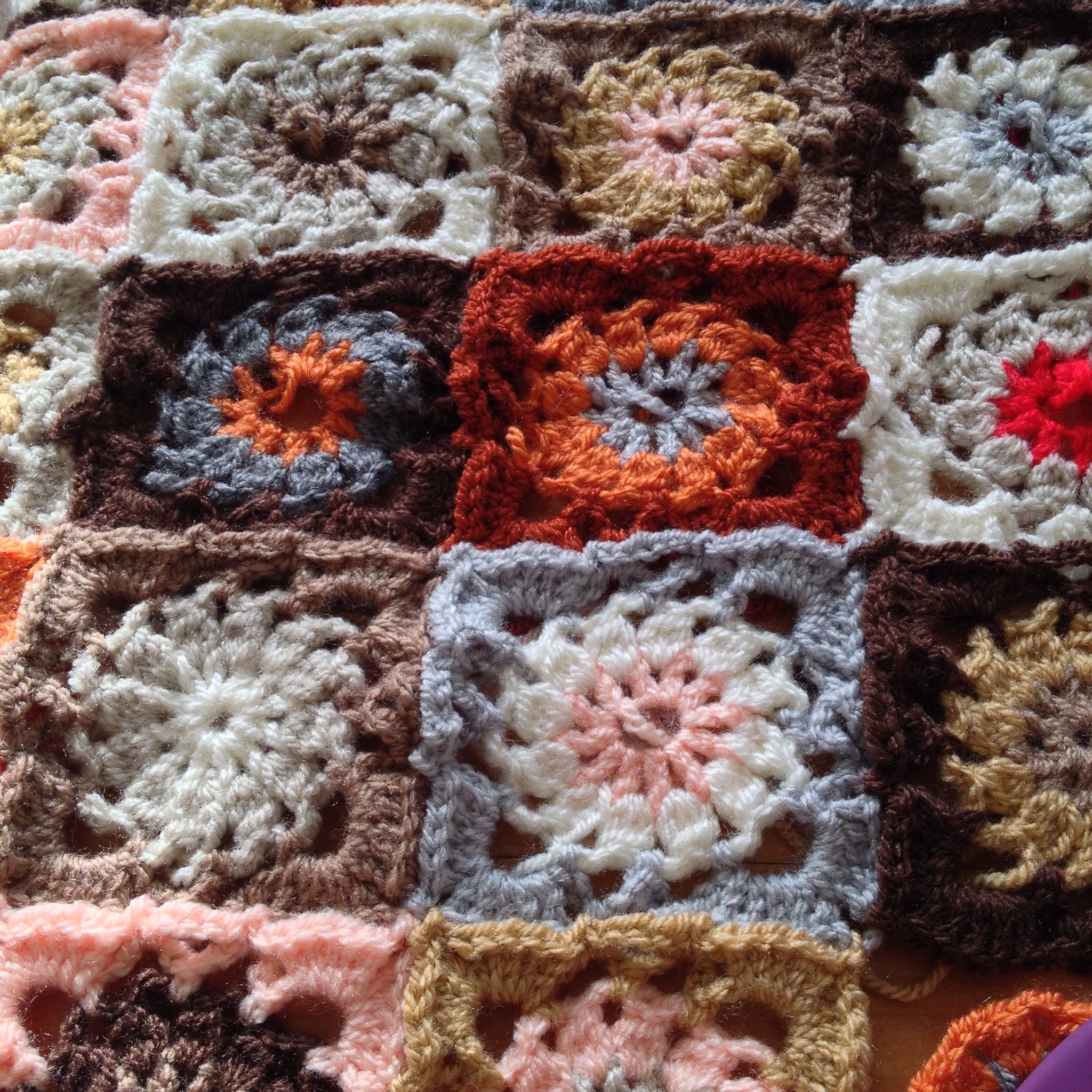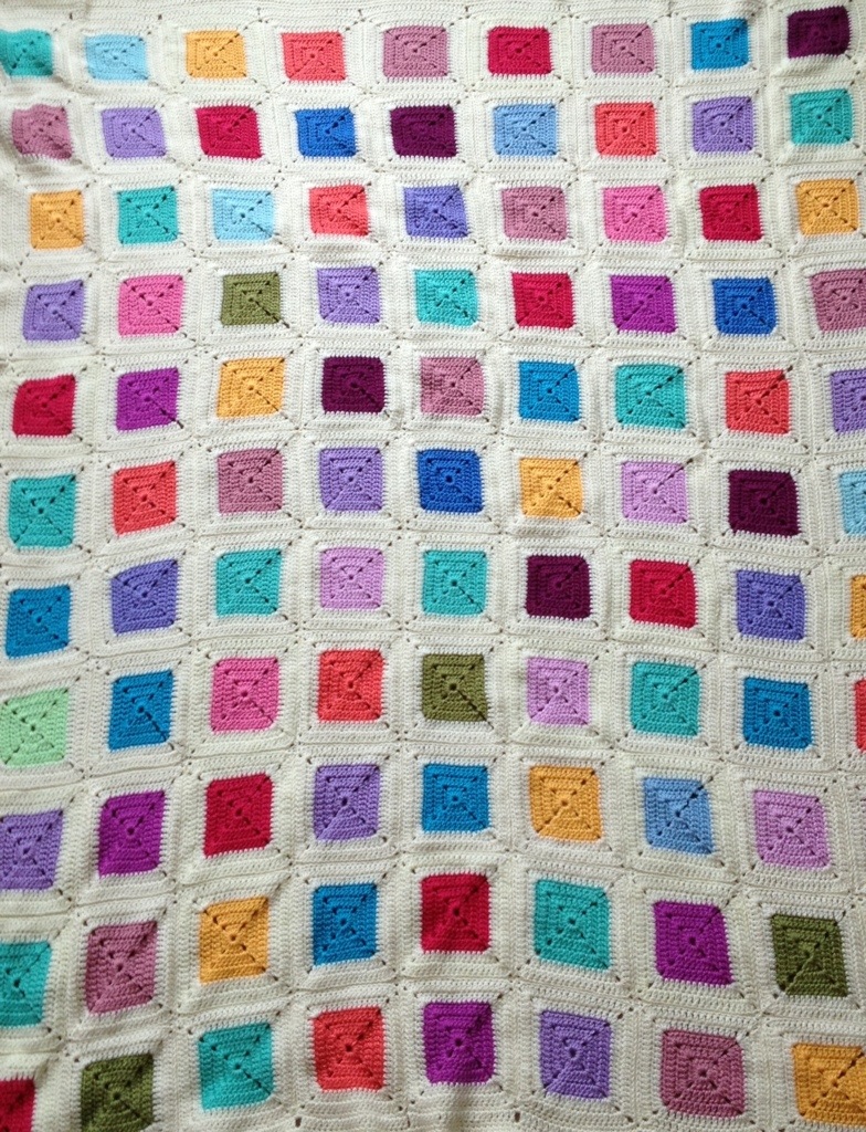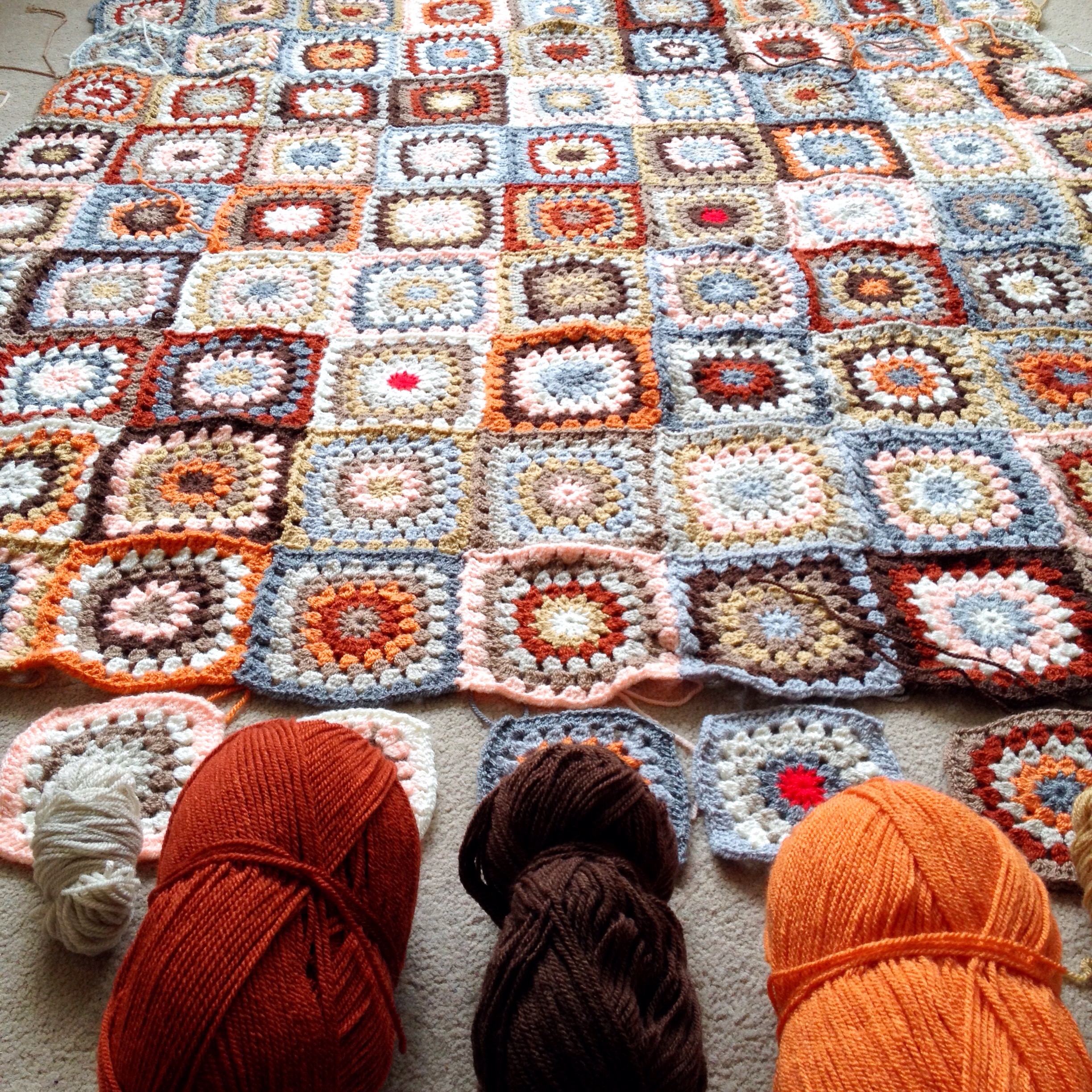 Choosing where to put each colour was quite a fun process and involved me crawling around the floor moving squares while S called out “move that yellow one left…. NO…to the right of the purple one I mean…now put the purple at the top….and the orange needs to go down a row…” We then looked at it for a day or so until it really was getting difficult to move around it without the risk of spilling coffee (the horror!) I decided it was ok, took a photo on my iPhone and then used that as a reference when I crocheted the squares together.