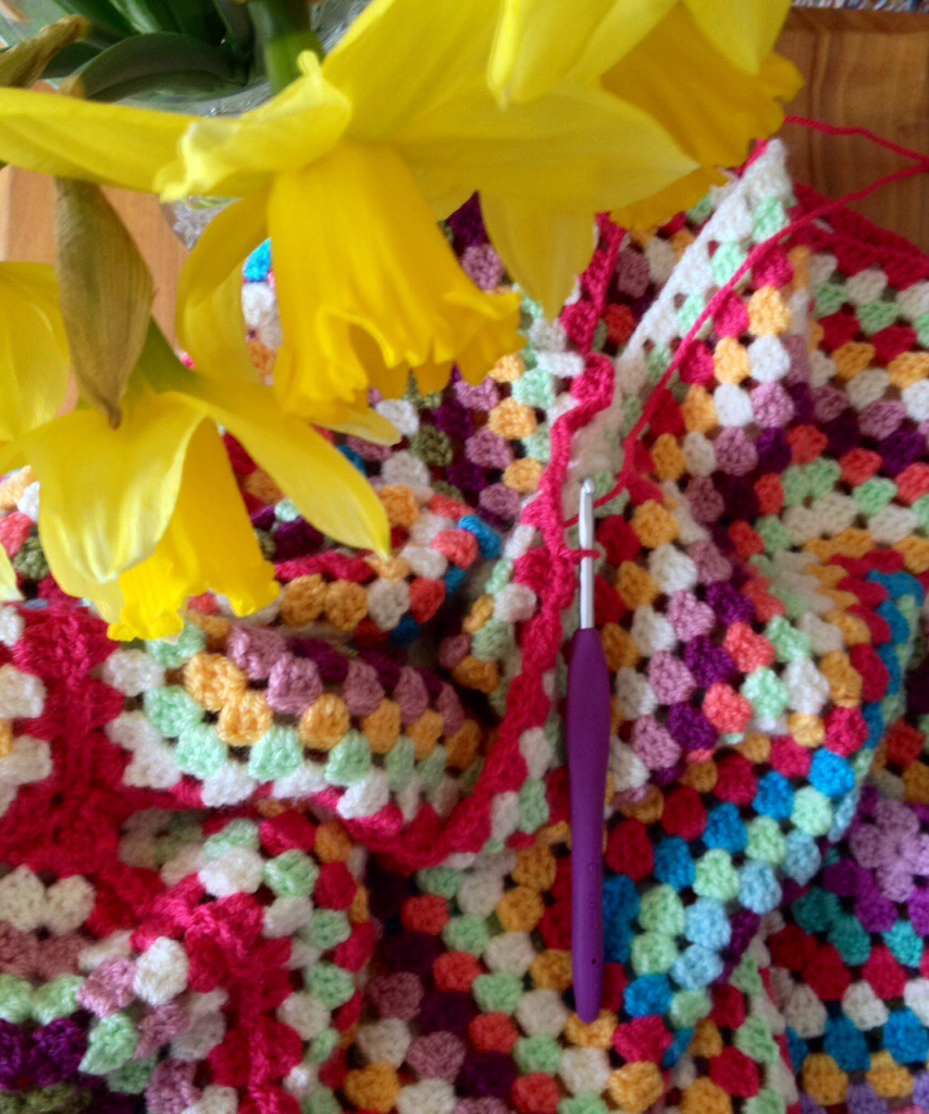 I’ve managed to do quite a bit of crochet in the last week, just picking up and putting this down as soon as my right hand starts to feel sore. Granny squares always grow so fast, which I think is probably part of their popularity. My other Coast Blanket squares, I think, are 30 rounds, so I haven’t got much to do now on this last one. Then I can undo the joined squares and rejig the blanket to make a sensible size, rather than a long narrow blanket suitable for a giant.