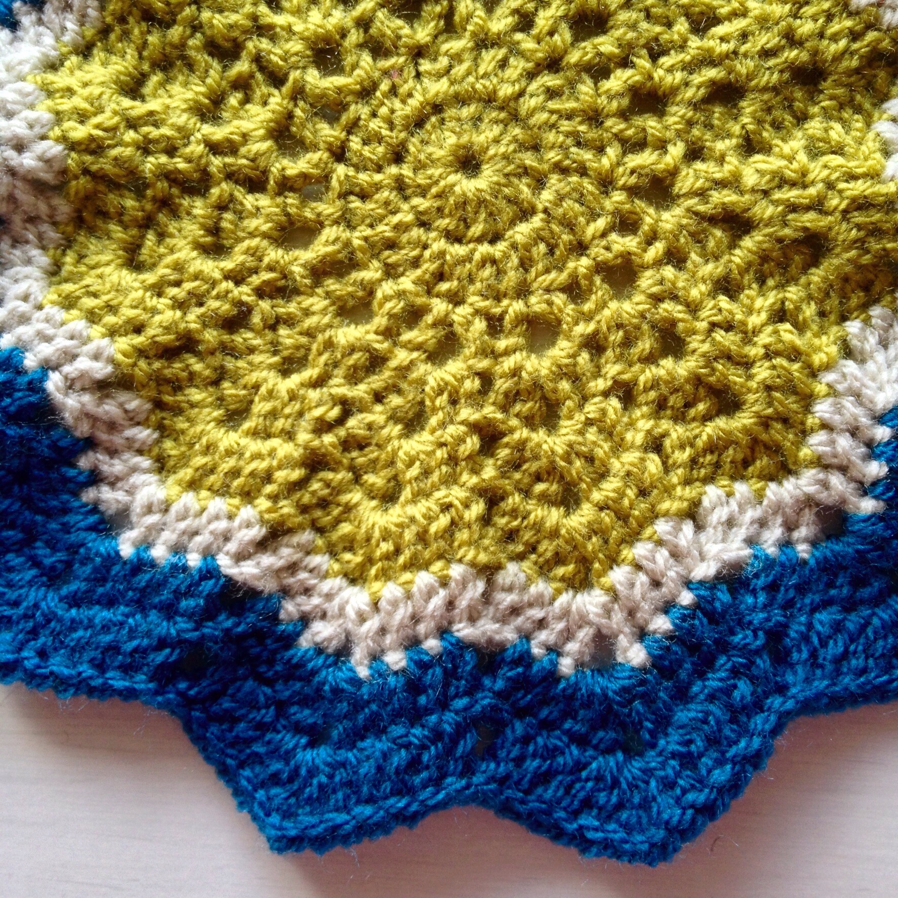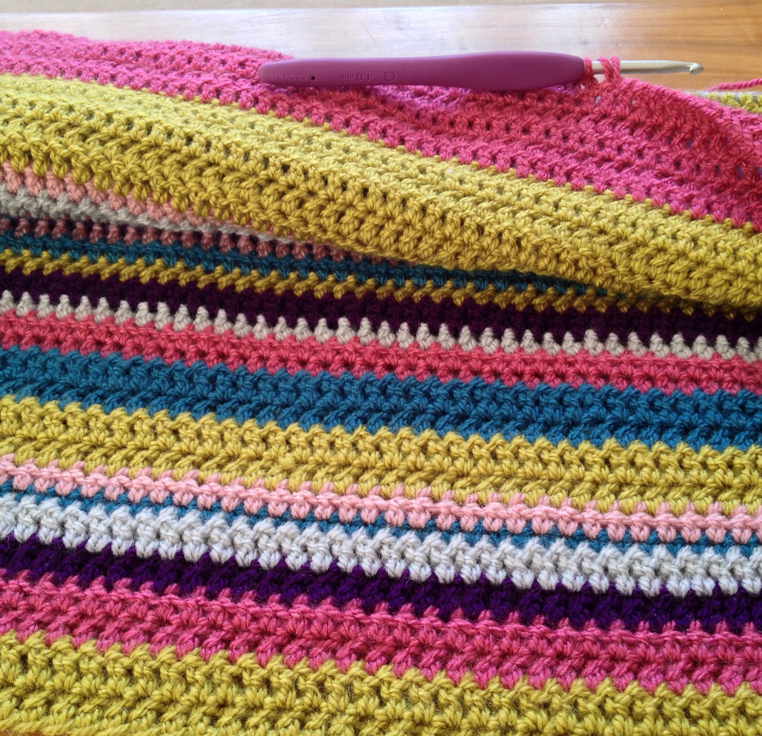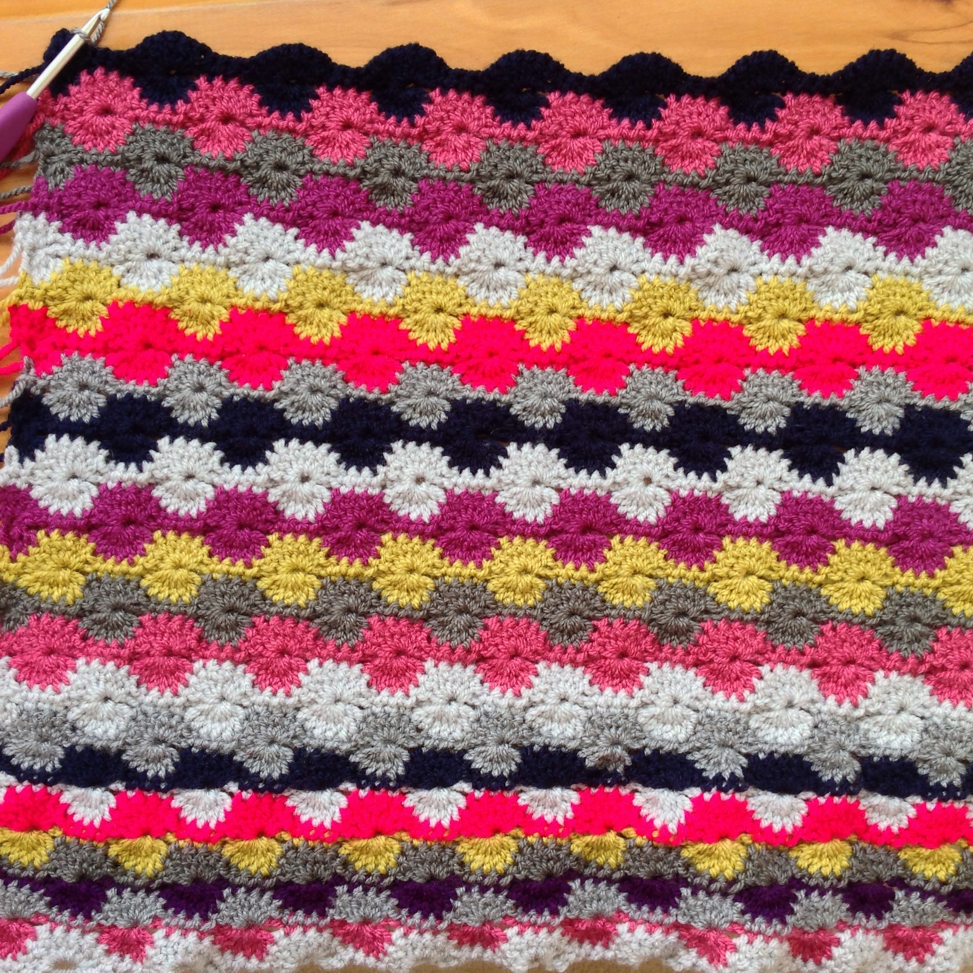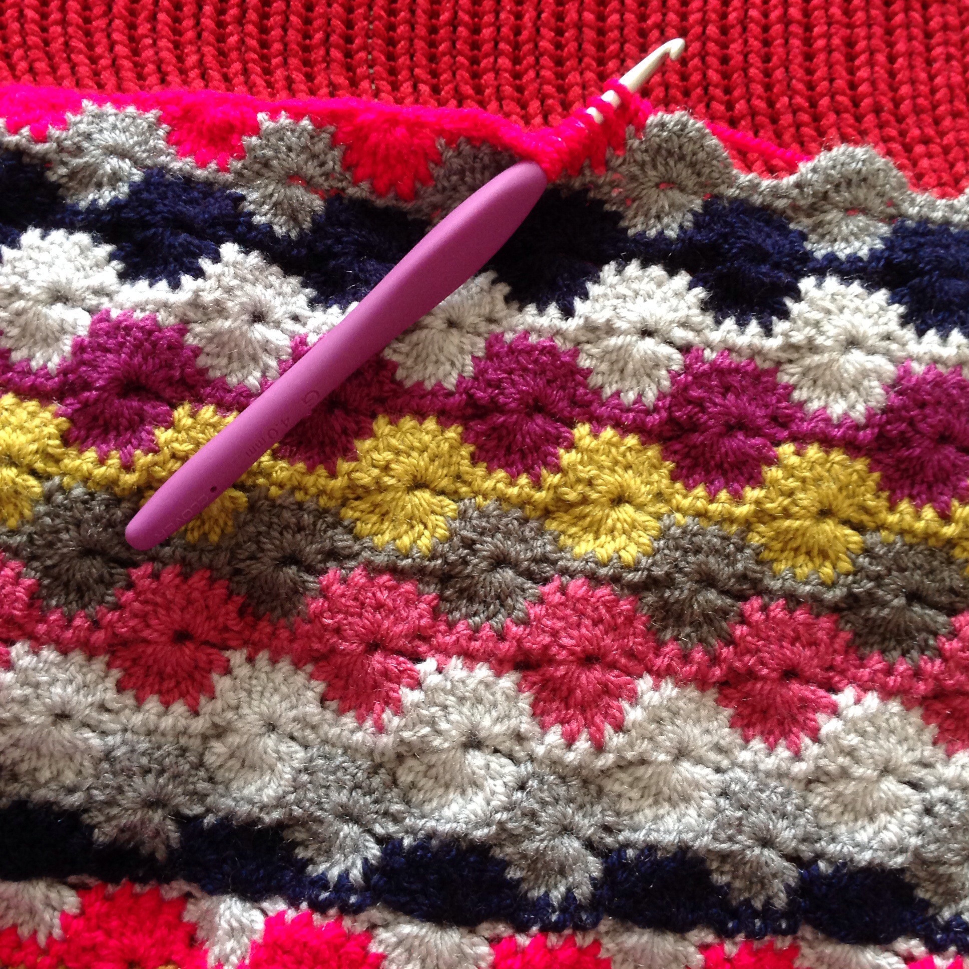 It’s my own design. I’m doing a random mix of rows of trebles, half trebles and double crochet (sometimes single rows, sometimes more.) Mostly I’m turning at the end of rows, sometimes I don’t as I like the variety of textures and height of stitches this gives. It will have a border around it. There’s no huge hurry to complete this as the baby’s not due for a few more months.