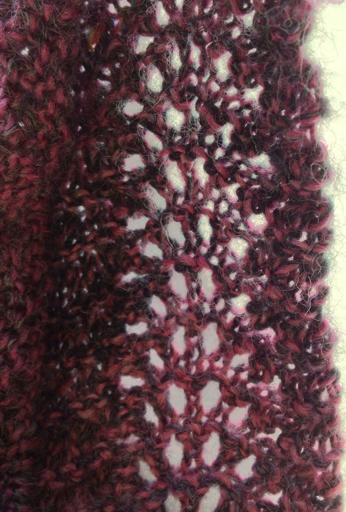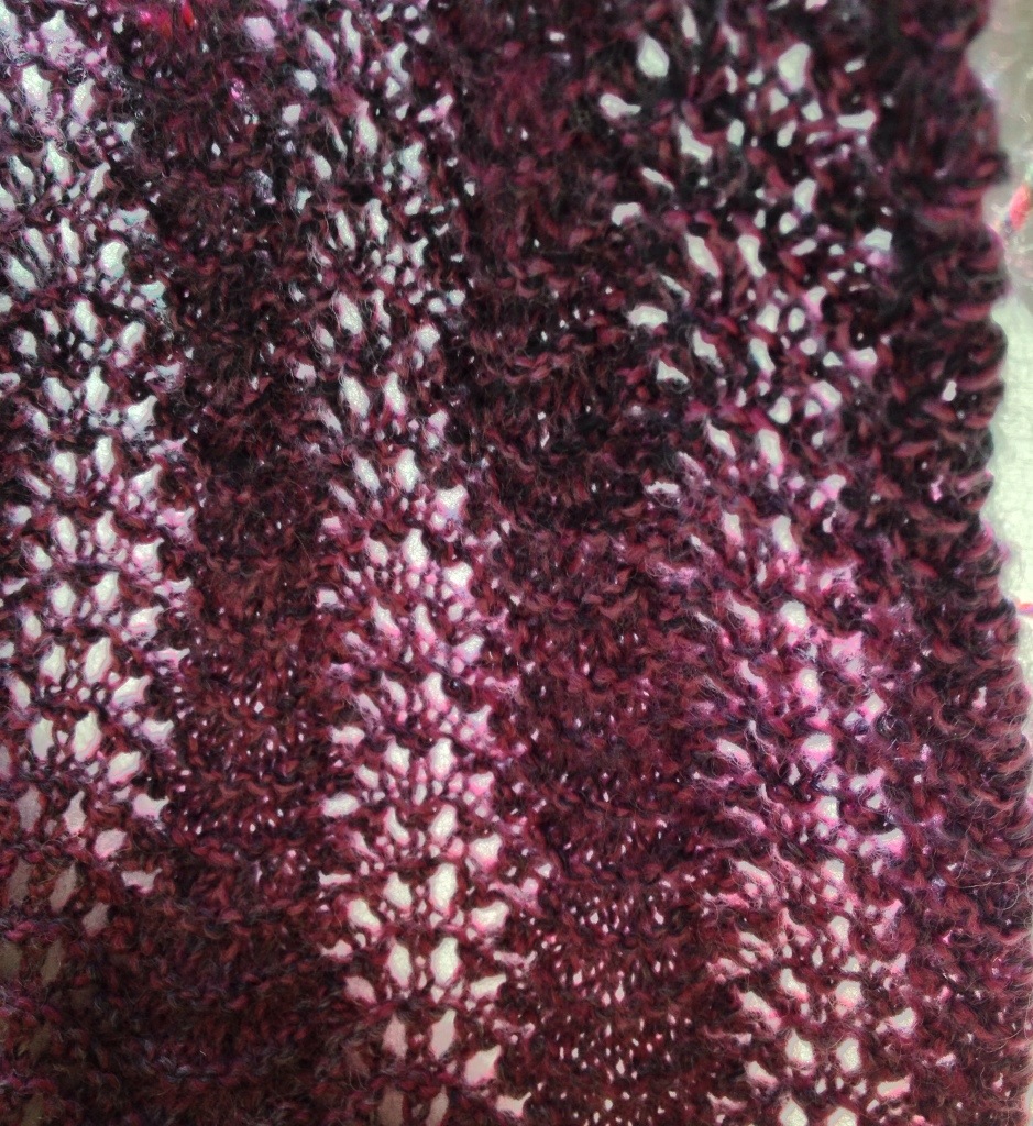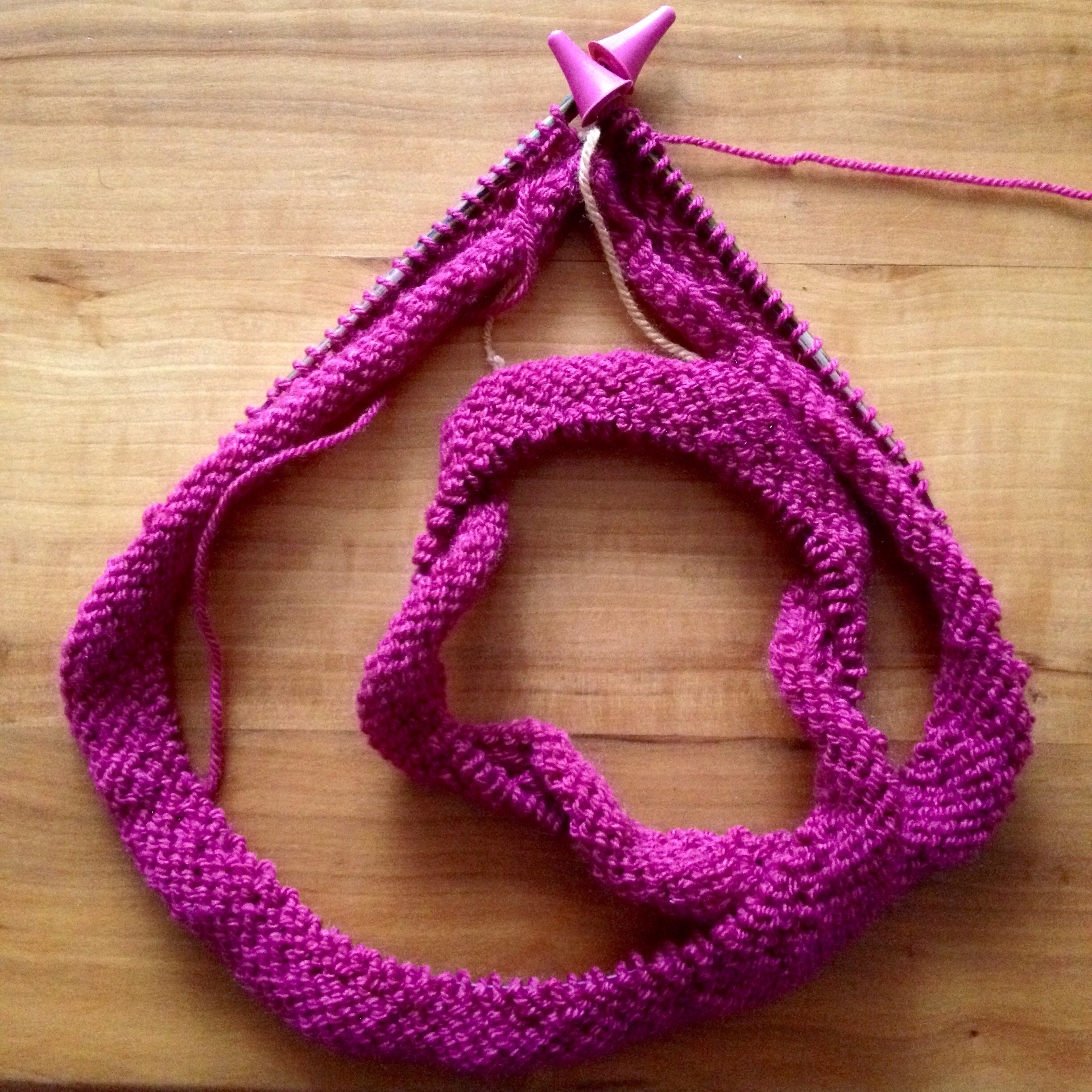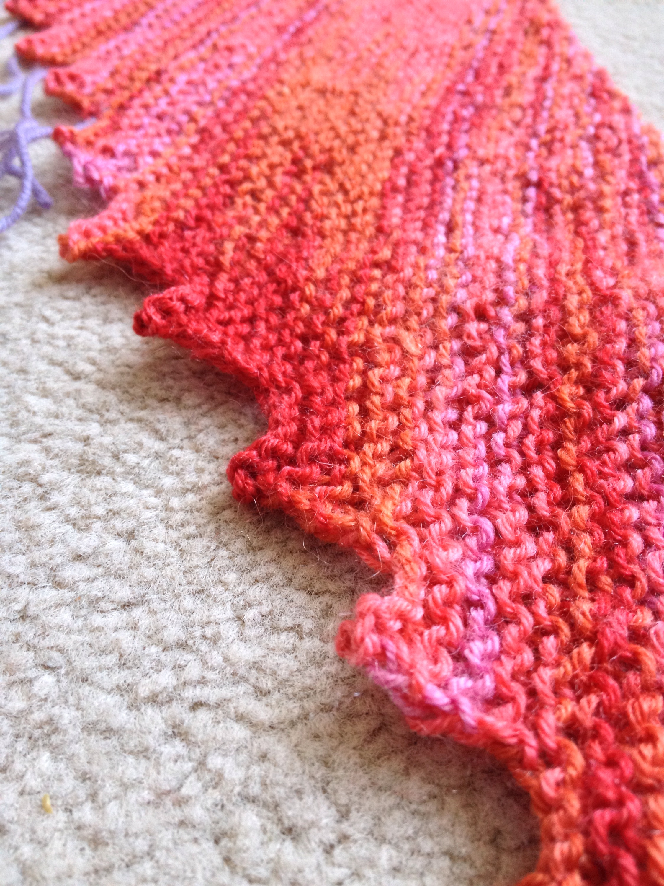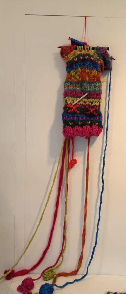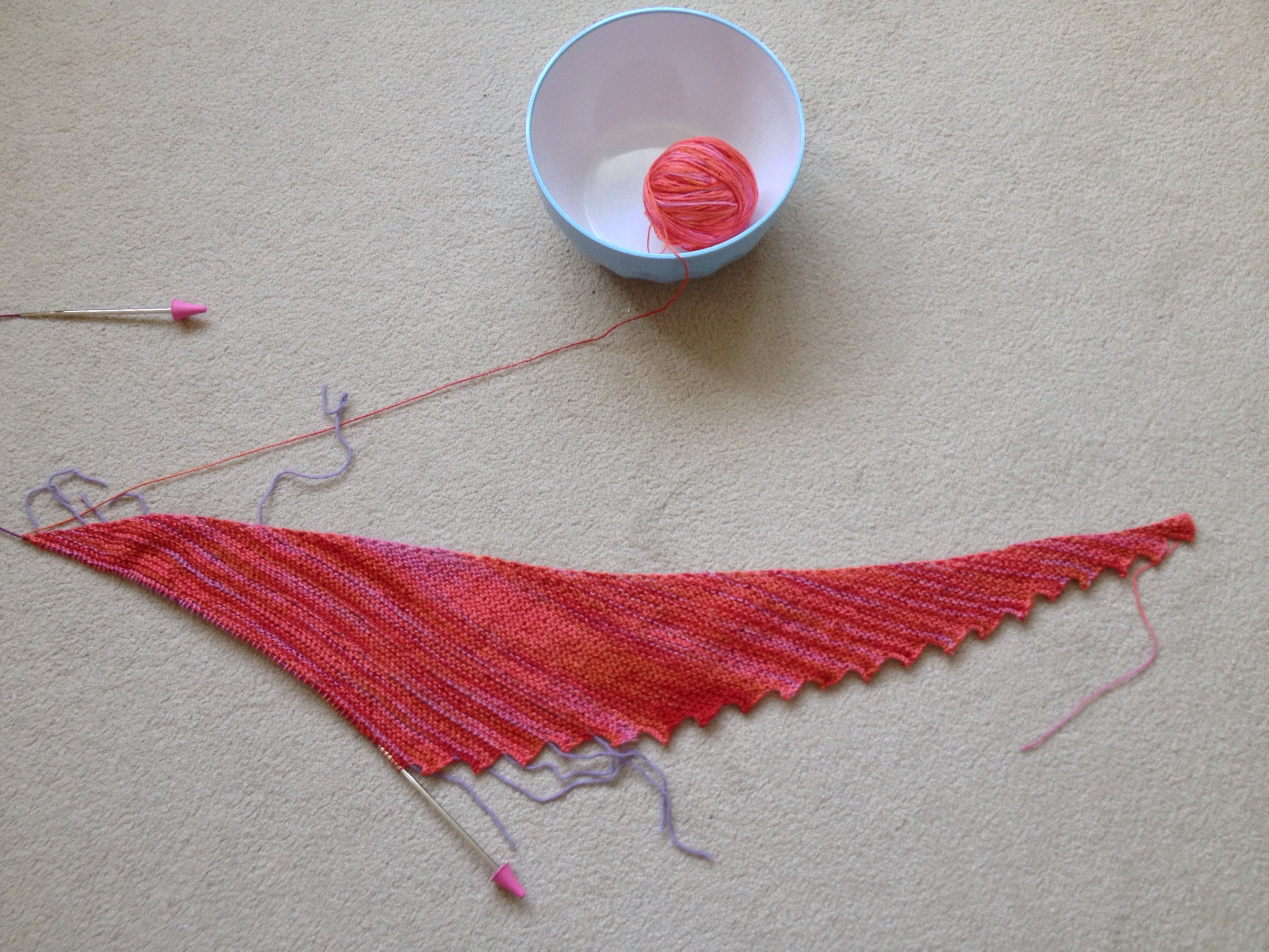 I can bear to show you this Hitchhiker again now. I undid about two thirds of the finished scarf. It was all ready on Christmas Eve to have the ends darned in, wrapped up and given the next day, until I noticed something rather strange. It was not a missed stitch, but a vertical row of 8 or so little stitches like plant shoots reaching up for the light. An alien encounter! I can’t believe I hadn’t spotted that and it was impossible to correct, without leaving a big hole. I must have picked up a stitch where there was none. I felt sick, so it’s been bundled away for weeks until I felt I could redo all that garter stitching. I’ve made good progress adding a little at a time. I took it to Knit group at the pub this week and knitted and knitted until I realised I was holding a mere 3″ of wool. Oops! I have more, so that’s ok. As much as I love this Tosca Light by Lang, it is pretty tricky to undo. It’s fluffy when knitted, so like trying to rip open brand new velcro shoe straps. In the end I got so fed up that I grabbed my scissors several times and ended up with about four balls. I’ll forget about those for now and start a new reserve ball.