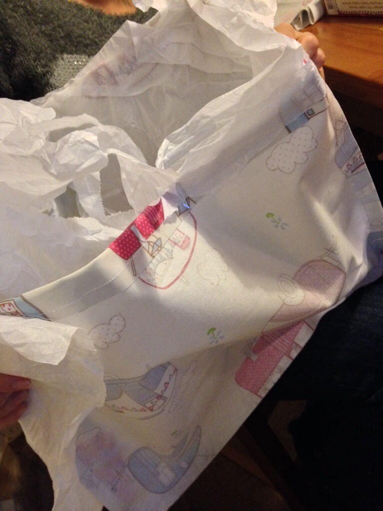 A. also brought along this gorgeous crochet shawl that she’s made for one of her young daughters. Apparently the yarn was cheap stuff and on offer in the local wool shop, but it feels luxuriously soft. Privately I thought it would rather suit me when I wear my smart black woollen coat and could imagine shimmering into a carol service, but sadly it was popped into a bag on the floor across from me. No stealing. Rats!