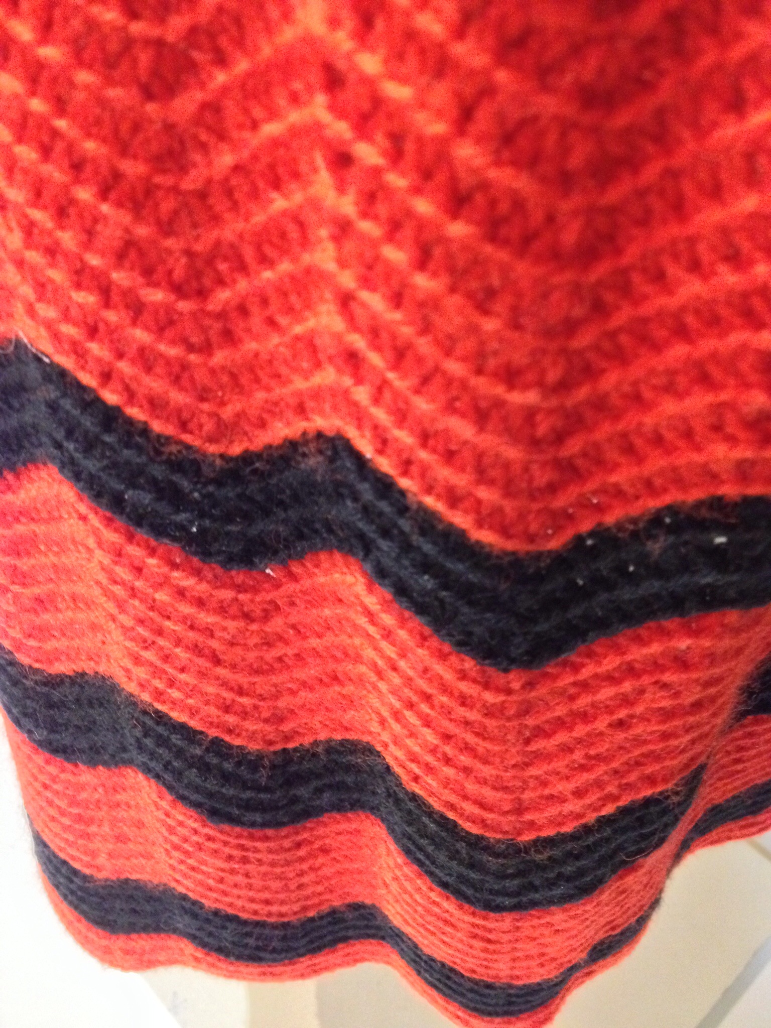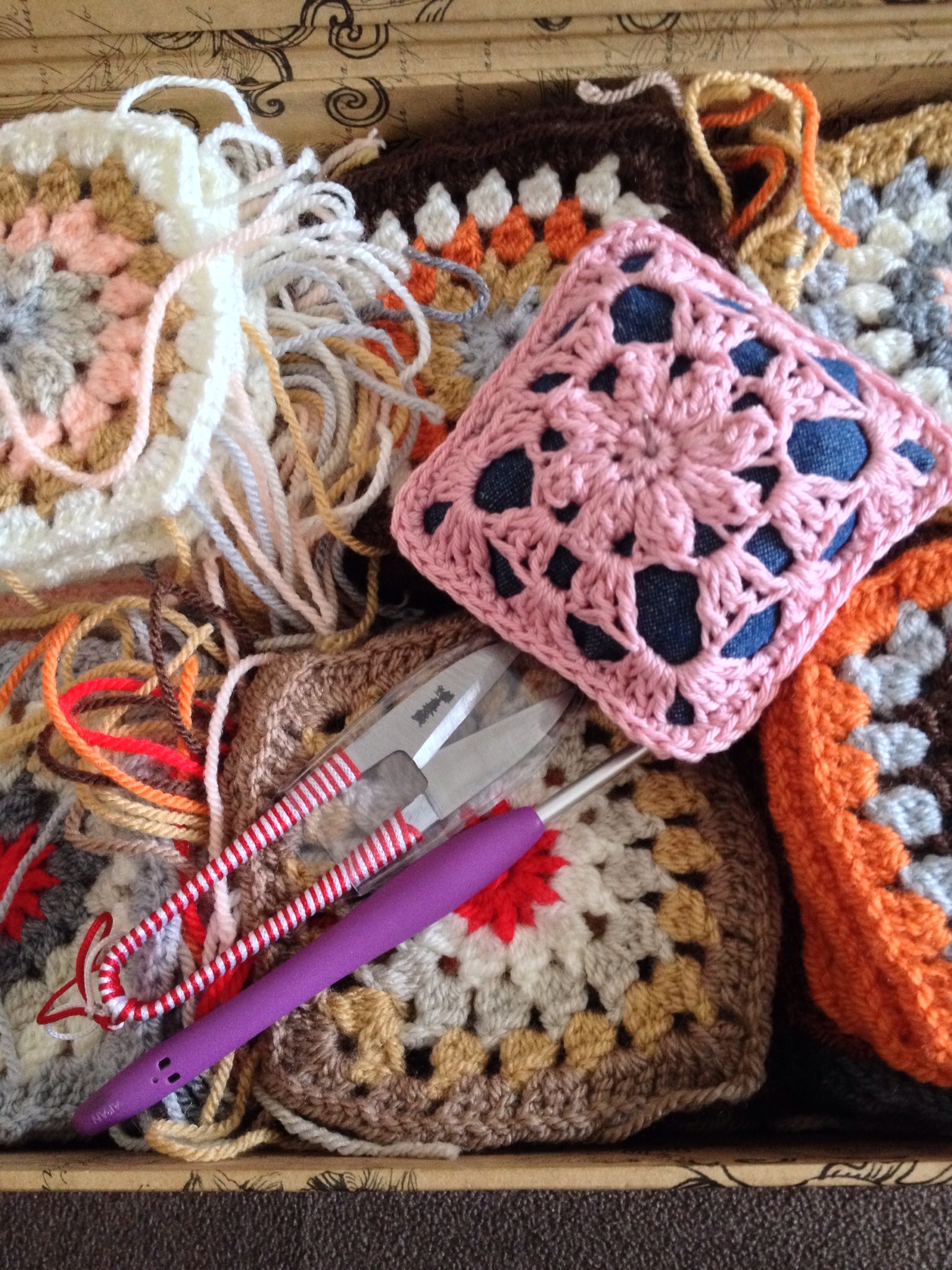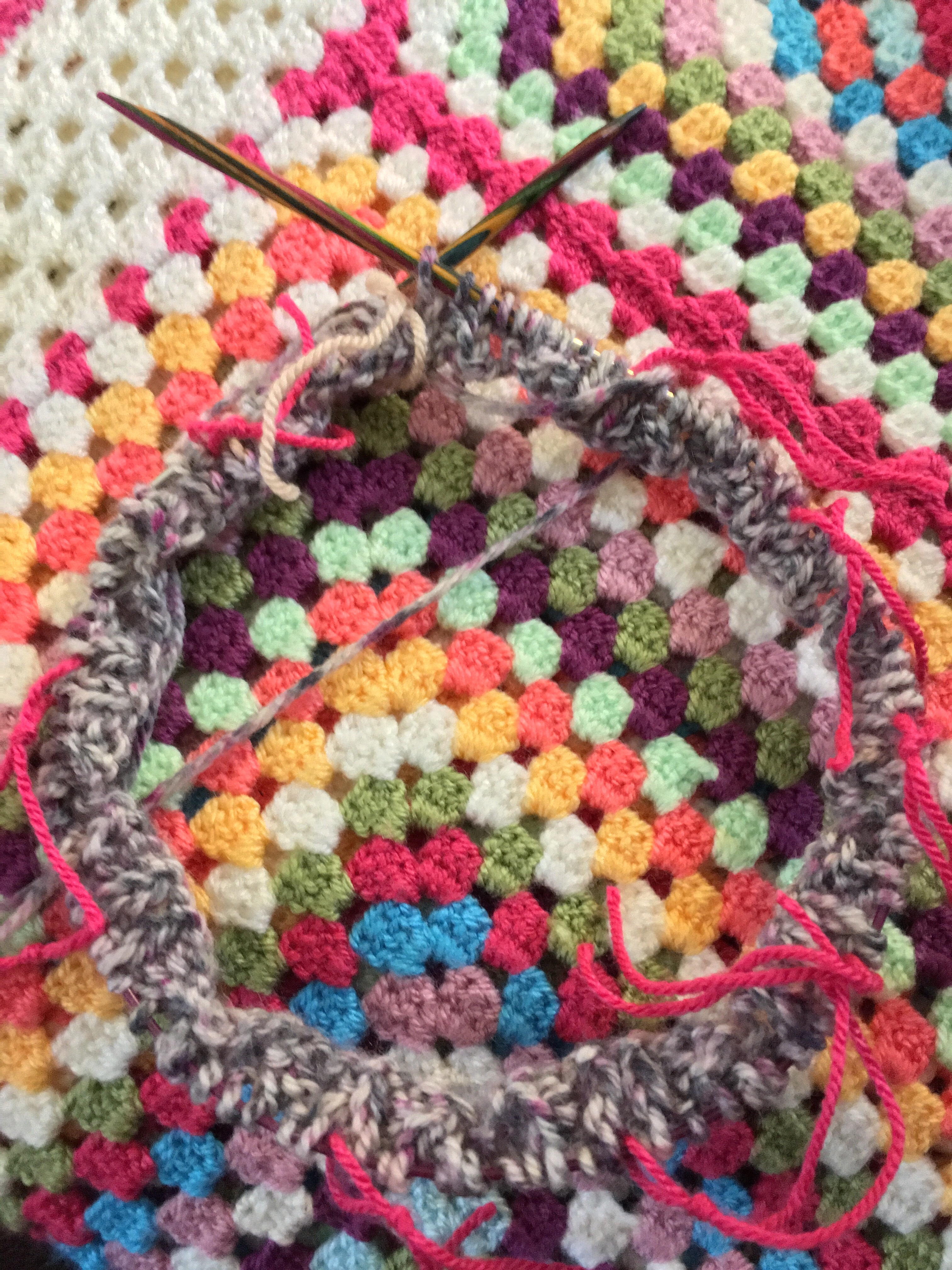 Last night I chose my border colours and sat down to start the tricky first row. I don’t think I want to crochet through the end posts again, yes it’s less gappy than working around, but it means you’re in danger of pushing out some of your darned ends. Phooey! It’s also damned tricky to do. That made me pack up my Hitchhiker knitting to take to Knit Group instead; as I didn’t think the light would be good enough to see, or the company would want to hear my groans and sighs.