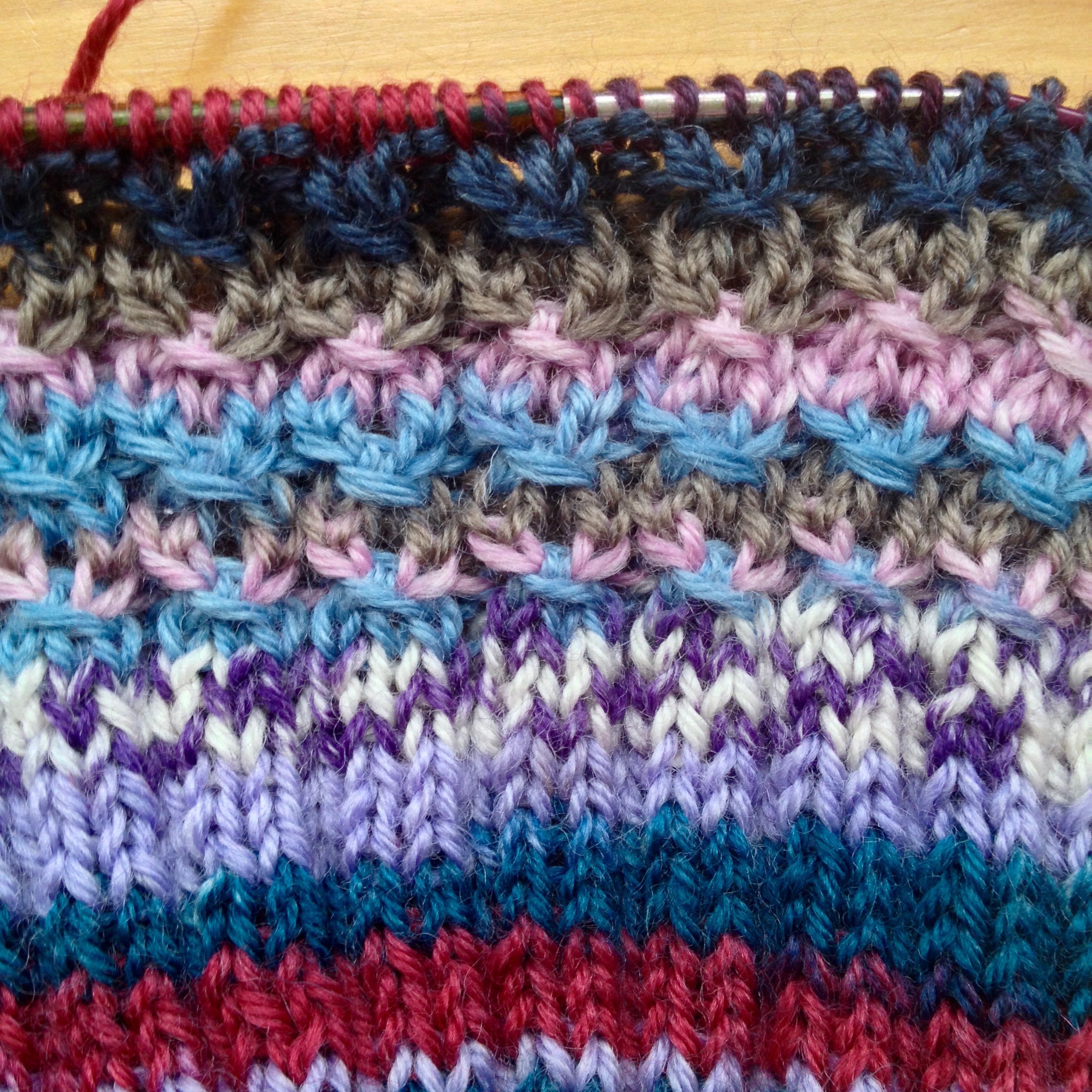 I’ve spent a bit of time playing with my yarn leftovers and planning out my next strip of moss stitch (aka linen and granite) blocks. I thought it might be easier than trying to do it in the pub at Knit & Sip, in the semi dark. We ended up not meeting anyway this week, but no matter; it’s quite nice to have a plan. The fewer brain cells used during the evening, the better I find. It’s not my brightest time. Nor is very early in the morning. My optimum time seems to be between 10-3pm! This isn’t new either. I’ve always been the same. Are you at your best in the morning, evening or middle of the day?