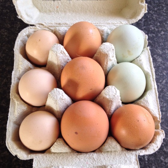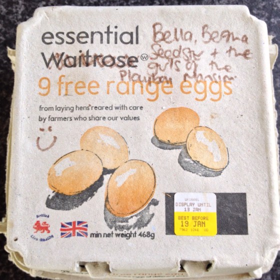On our way up to Yorkshire we met my cousin and family for Sunday lunch and she gave me this box of freshly laid eggs from her hens. Aren’t they pretty colours? The labelling on the box made me laugh. I think there might be a lucky rooster in the mansion!