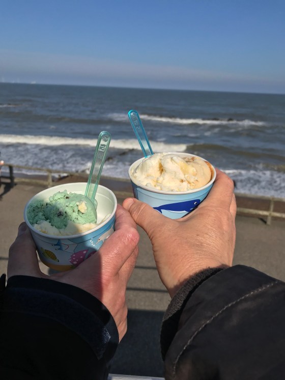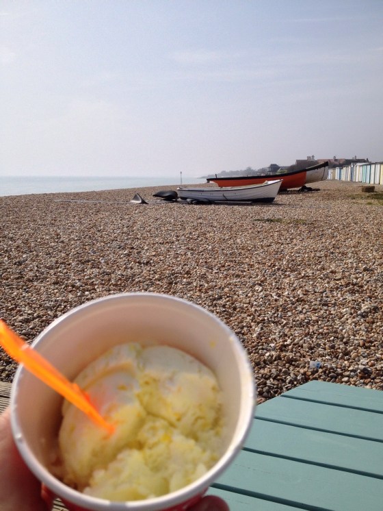 Sun, sea and ice-cream. The first of many this year, I hope. This was Friday at Bognor Regis after a good walk along the prom. It’s lemon meringue flavour; and had fizzy crunchy little meringue pieces mixed into the tangy lemon. I’m looking out for this again!