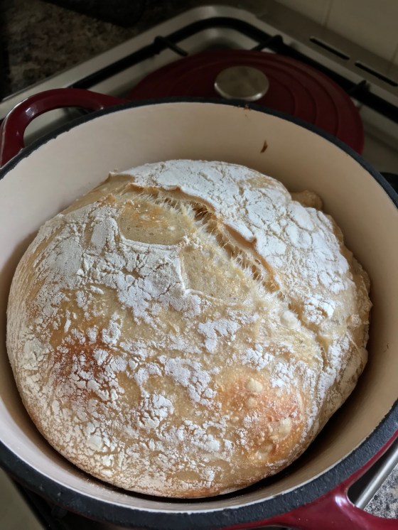 Adoring: no-knead sourdough cooked in my charity shop treasure. The moisture in the bread means it cooks in its own steam. You then take the lid off for the last bit to burnish the top. It needs to be just this side of burnt for the flavour and crustiness.