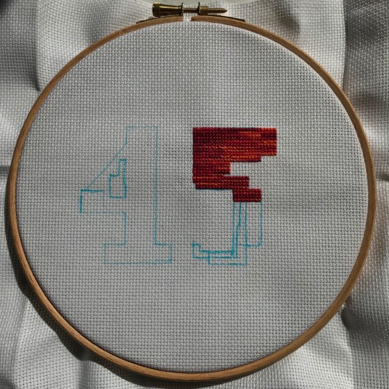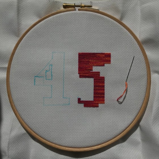 I saw hand drawn felt tipped numbers in the window of someone’s house the other day. This gave me the idea for a new cross-stitch. I thought I could rest my right hand on top of a hoop to keep it steady on the edge of my desk, while I stitch with my left. This is going really well and doesn’t seem to aggravate matters. The last time I did any cross-stitch was last July in Regents park, London. It feels like aeons ago.