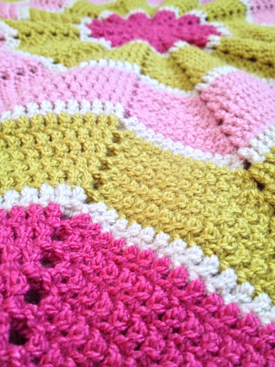 The first, made a few years ago, I gave to my hairdresser for her new baby. She used it as a car blanket and said it was a perfect size. The second I sent off to Knit for Peace along with the Baby Hexagon blanket and the Squares and Stripes blanket. I’m not sure what I’ll do with this third one; I’m not making it for any reason other than to make something new. Ahem, also after my Dry Lent finishes I thought it might be good to take to the pub, when I meet up with other crafty people, as it’s simple and easy. You know what I’m saying?!