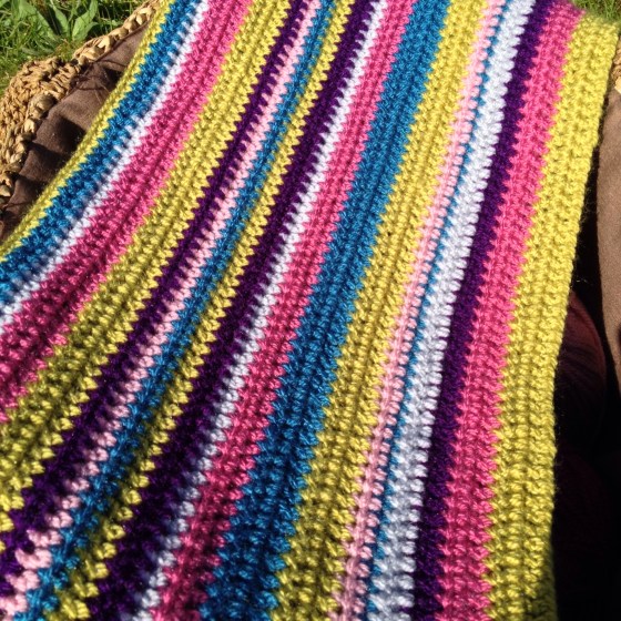 I didn’t want the new baby – due in June – to feel left out and so gathered up my balls of Stylecraft. My friend likes bright, is still all for colour equality and is very happy to have another striped blanket. I’m loving zipping along, doing a mixture of trebles, half trebles and the occasional row of double crochet.
