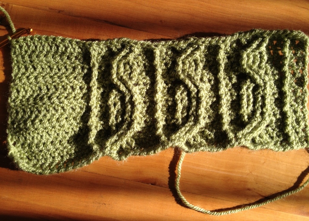 I’m wondering if the hitch is because I’m crocheting as a leftie, though there shouldn’t be a problem other than the cable slanting t’other way. Maybe there’s a pattern problem (extremely unlikely) or maybe I’m just being daft and getting something wrong. The little strip looks good enough until row 4, which is actually row 2 repeated. After then the cable morphs into a tangle.