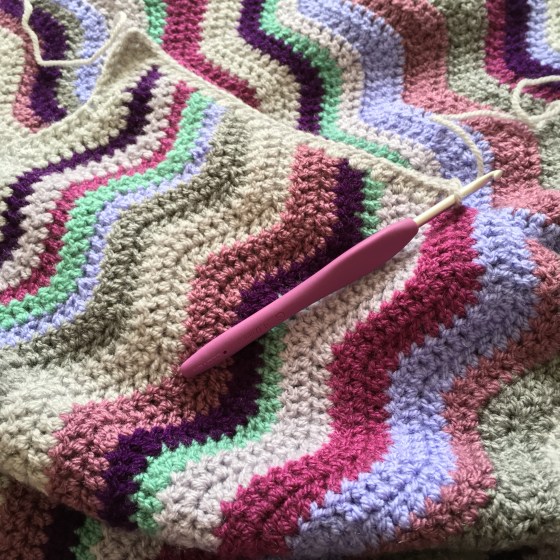 I think I’ve got to that age where written lists and e-reminders flashing up on my iPhone are a vital part of leading an efficient life! If it’s not written down it seems it doesn’t get done some days…I have a brain of custard. Today’s reminder was my weekly Yarn Along alert. It isn’t always helpful to see if I’m strolling along in London or far away from any woolly stuff, but at times it really prompts me to consider what I’m making. You really don’t want to see the same ruby wool for the third week in a row, do you? So what a good motivator it is to start on the border of my ripple. It’s been sat in a bag at the side of the sofa, looking reproachfully at me for a week or two. I haven’t crocheted properly for ages, apart from last week when I took a ball of cotton to a pub craft meet up. I learnt, the hard way, to take the simplest thing as chatter and patterns don’t go well for me, even very simple lace knitting.