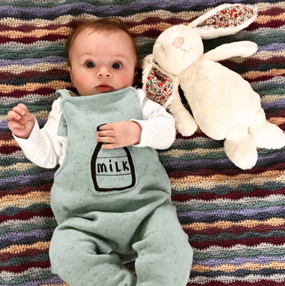 Here is Winnie and her Wave Blanket. Isn’t she beautiful? I love the way she’s got her hand on the top of the milk bottle! She’s five months old now. Her Mum tells me she loves her blanket so much and uses it everyday in her pram, the car and her bouncer chair. Wherever they go people ask where it is from, it’s lovely knitting’ (sigh! / smirk.) It’s attracted a lot of attention.