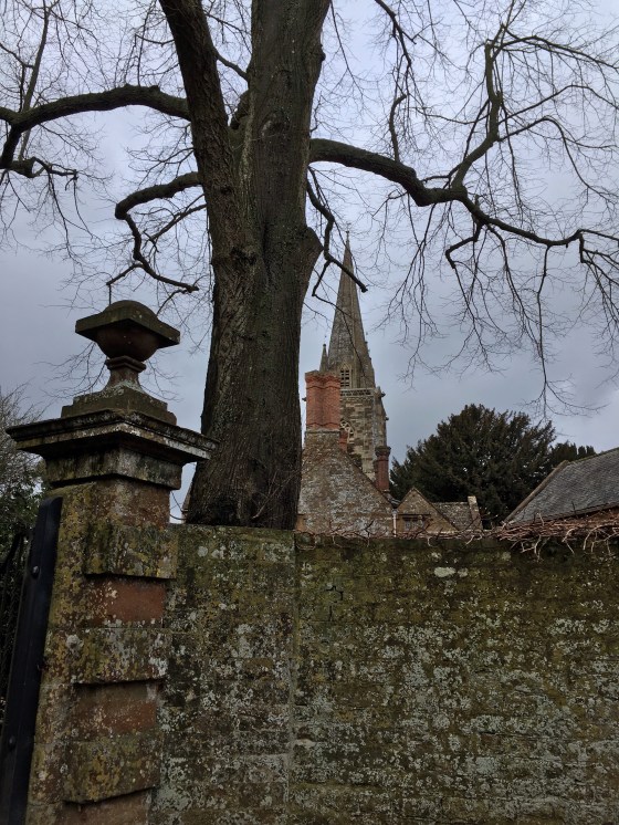 B was trying to walk fast, keeping up our brisk pace, get the heart pumping etc and burn some calories (her multiple gins at the weekend were playing on her mind.) Her fitness app voice notifications were kicking in with how many kilometres we had walked, how fast our average pace per km etc but I kept stopping dead to whip out my iPhone. I can’t help it when I see witchy wintery trees with an ancient spire behind. I love the twigs lying on the top of the wall where they’ve fallen off.
