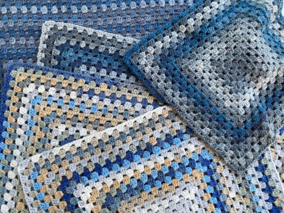 I started the blues and greys square on holiday in September, in Cornwall. I bought a couple of balls of Hayfield Spirit DK yarn, a wool blend, and a hook in Penzance. It was pure pleasure sitting up in bed in the earlyish morning, in our holiday house further west, looking at the sea views, with the sun sparkling on the water.