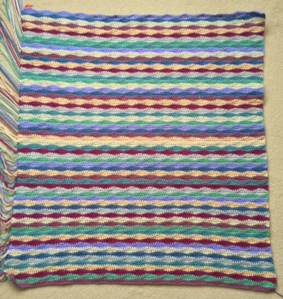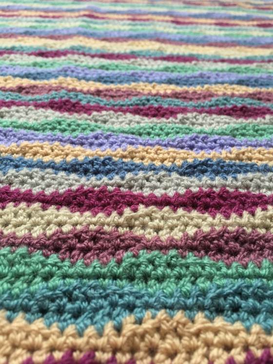 On rainy Sunday I sat and crocheted on and off for several hours, this means I’m now wondering how much more to do. It’s a baby blanket, as you probably recall, and now measures 28″ by 31″. It’s obviously going to be wider than 28″ with a border, but I’m not sure how much longer it needs to be; as I always think that to be properly useful a baby blanket could be big enough for when they are a toddler, and can to snuggle underneath.
