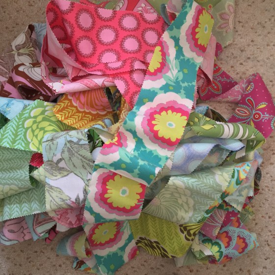 I already seem to be the joke of the group as I took along a Rowan Amy Butler jelly roll I got from Mollie Makes magazine (I’ve googled my own blog to find out when and where I got this!) I was thinking that I wouldn’t have to do lots of faffy cutting out and could actually sew at sewing club. Plus I knew it would help me practice sewing straight lines. The issue comes when the others naturally ask me what I’m making? I have no idea, truly. I’m just joining the strips and then again and again, as the tutor has instructed. I reply that it could be a bag, cushion, a thing or skirt. A ‘thing’ looks most likely right now…