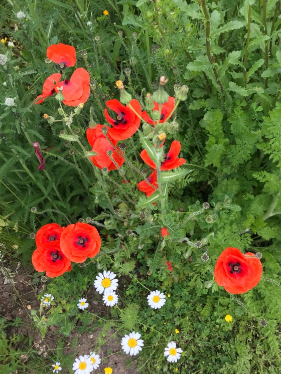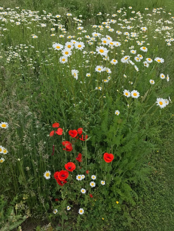 Moon (or oxide) daisies and poppies together are such a pretty combo. I keep seeing them at the side of our roads and on roundabouts, though the best place has to be like this; en masse in a meadow.