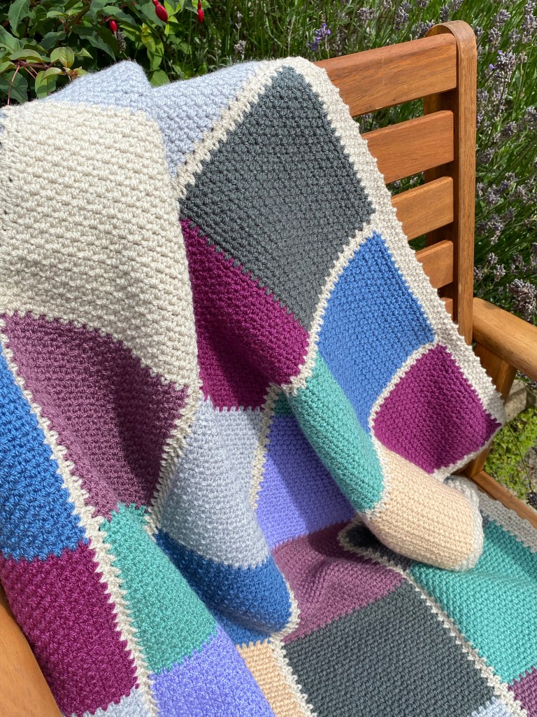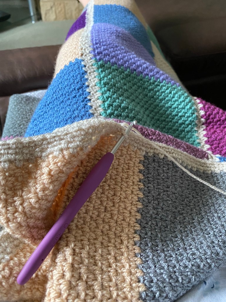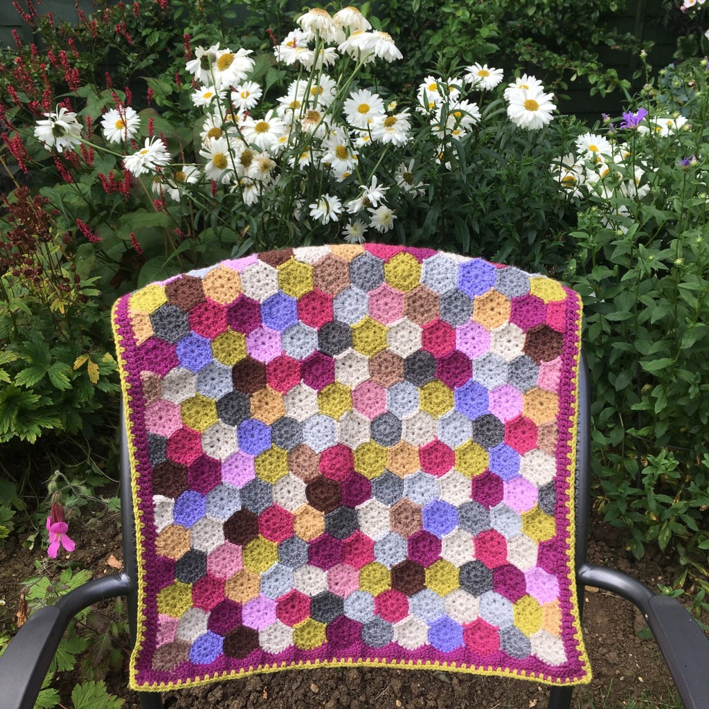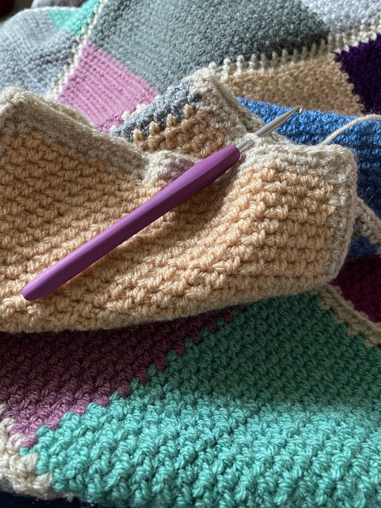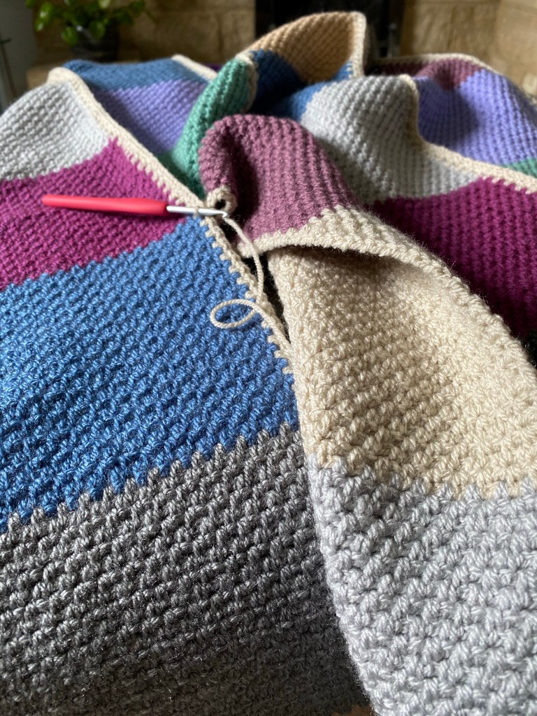 Last night with this in mind I’d started off with a bit of garter stitch knitting on my big stash buster blanket. I did two rows which is five hundred stitches. It all felt ok, too ok really considering that on my call with the medical insurance people I’d said it’s a pain level of 9/10 when I do anything, and 6/10 resting. It was back then, but maybe not so much now. It seemed common sense to move on to some crochet, just to properly test the water. I did four rows, or so, of the grape. Then swapped to the green and completed the block, while watching the penultimate episode of The BBC’s The Woman in White. So far, so good, which is fine, but have I healed myself and what will I say to the physio?