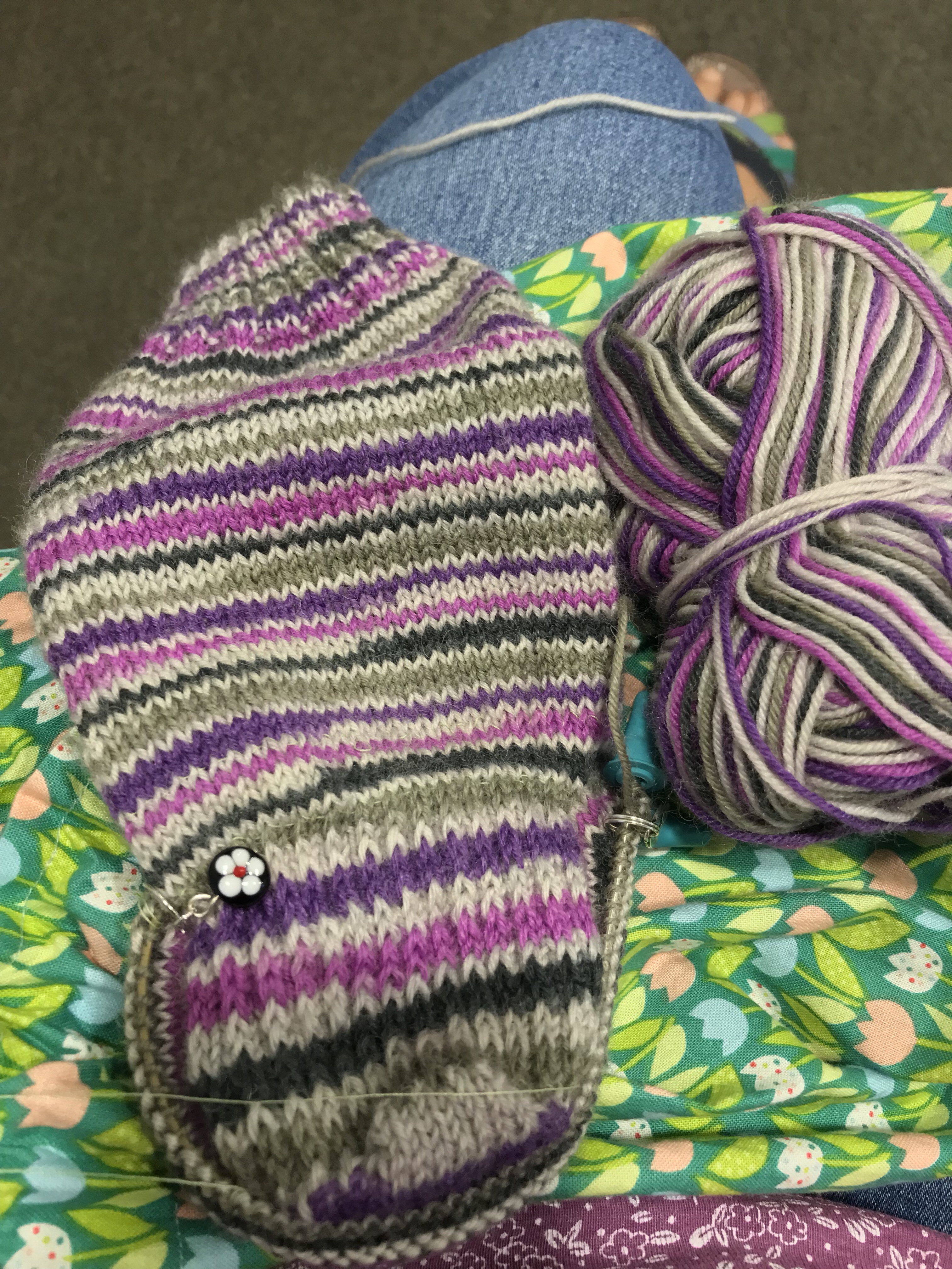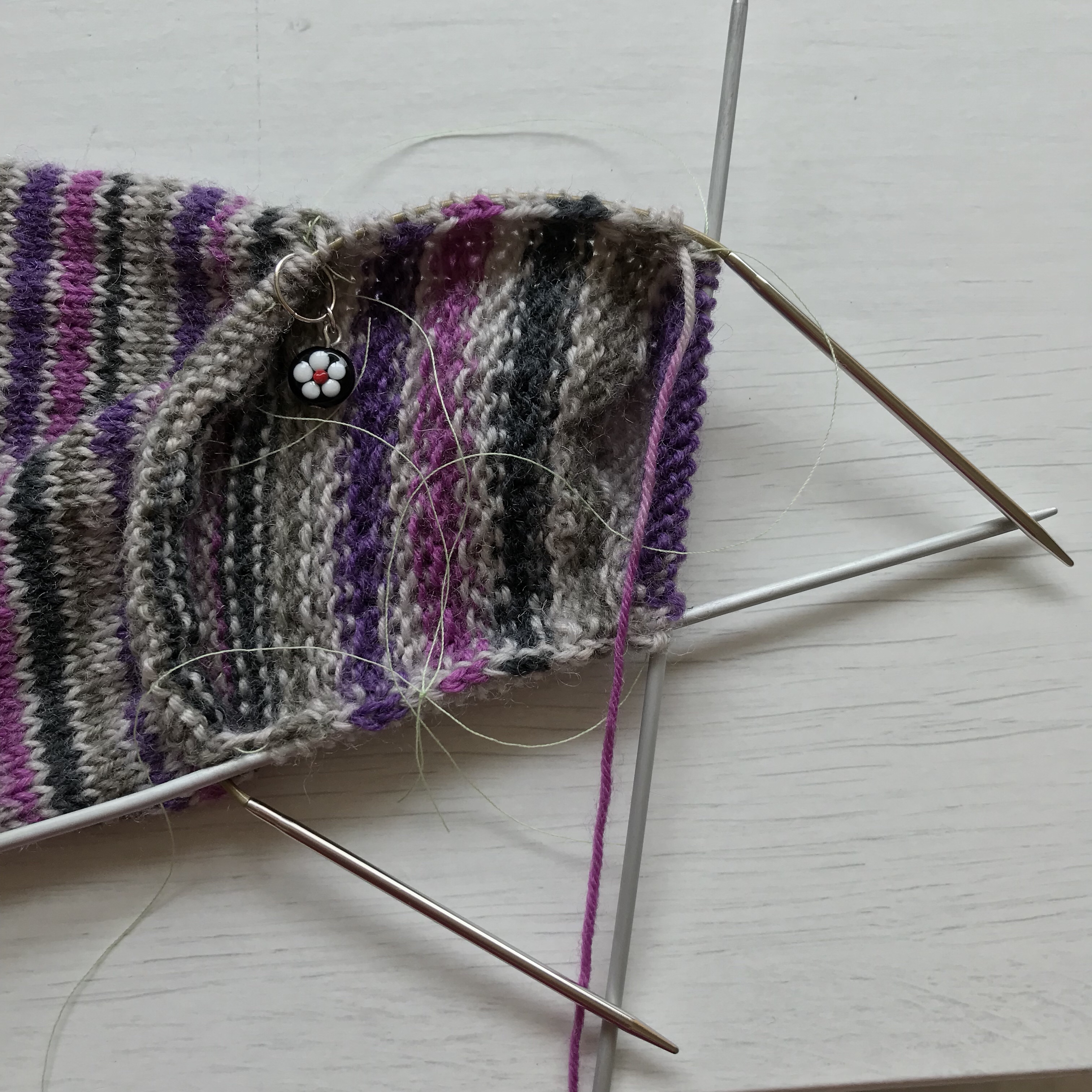 It all felt a bit iffy really this morning, but not so bad. Not a 9/10 anyway. Next stop was a bit of the dreaded sock, if this caused the problem before I should see how it feels now. Wow I did feel fuzzy about what to do and where I’d got to. Plus I had to look again at how to pick up the side stitches, where to put which needle and so on. I opted for a crochet hook then slipping them onto a second DPN this time. I’m now at the same point I’d got to before. Next time I’ll be breaking new ground, hurray!