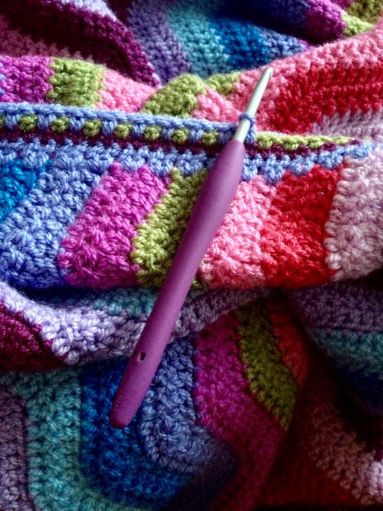 So that’s one of my 16 for 2016 done. It looks sooooo much better than it did. This is one of the blankets I made (all details here) when I was still newish to crochet in 2012. I’d fudged the edging, such as it was, and knew it too. These half treble, double and double crochet spike stitch rows really finish it a treat. I decided on the same Attic 24 inspired border as I crocheted for my Zesty Raspberry Ripple blanket. It’s pretty but not too elaborate.