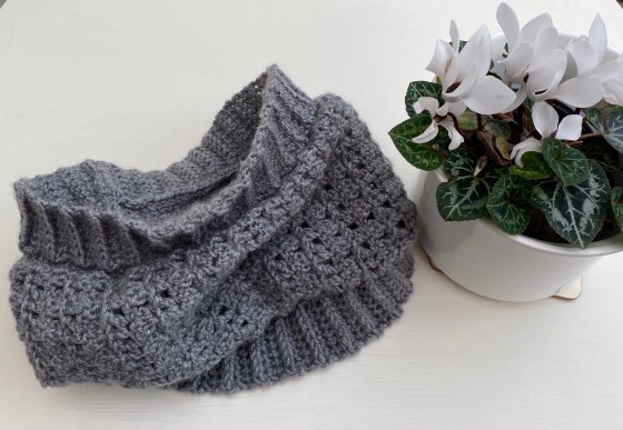 I really like Stylecraft Life Aran; it’s a good mix of wool (25%) and acrylic (75%), which works up well with a 6mm hook. It’s definitely cosy when turned into a cowl.