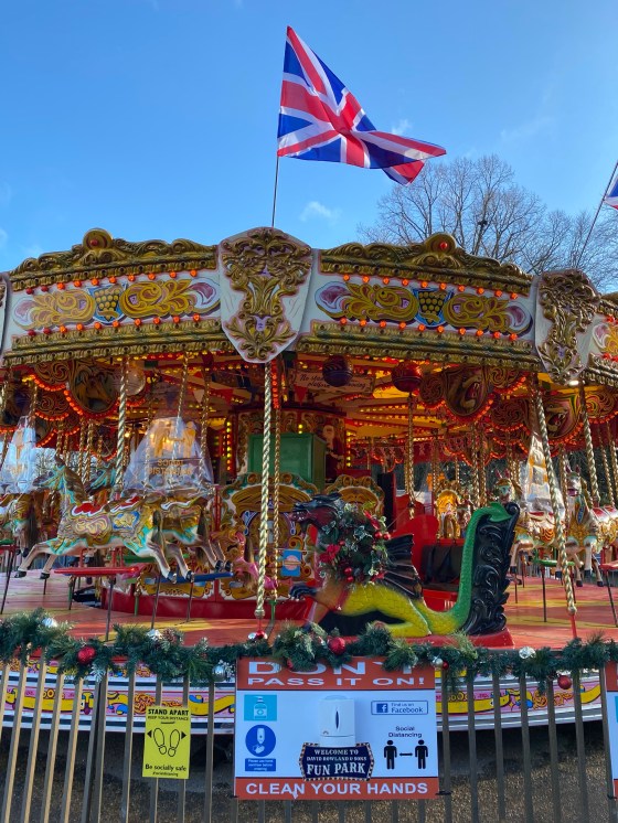 A carousel 2020 style: sanitiser, covers on some horses to distance people and spaces to queue on ….