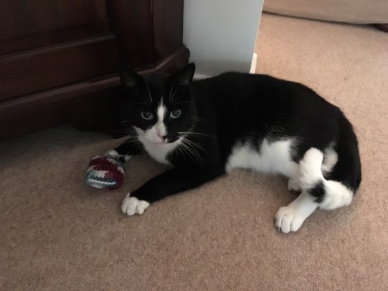 We all seemed to arrive at Mum’s with presents for Barty the powder puff tail. My cousin and my nieces all did and I took him a set of jingle mice. But this one was the clear winner: my friend and her dog George sent him a crocheted pillow filled with catnip (bought in Asda, it’s fab.) After I took this photo he got a bit manic. It was so funny to see this laid back ‘I can sleep for England’ young cat so excited. The pillow is already all tatty and with ends sticking out!